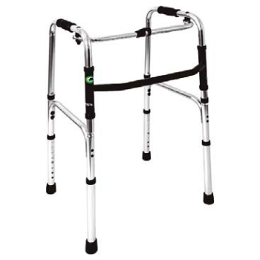 Andadera de aluminio industrial plegable para adulto. Marca EKOMOBIL. Con barras laterales para mayor soporte y puños de hule espuma. Con sistema de ajuste de altura en 8 niveles. Color plata.