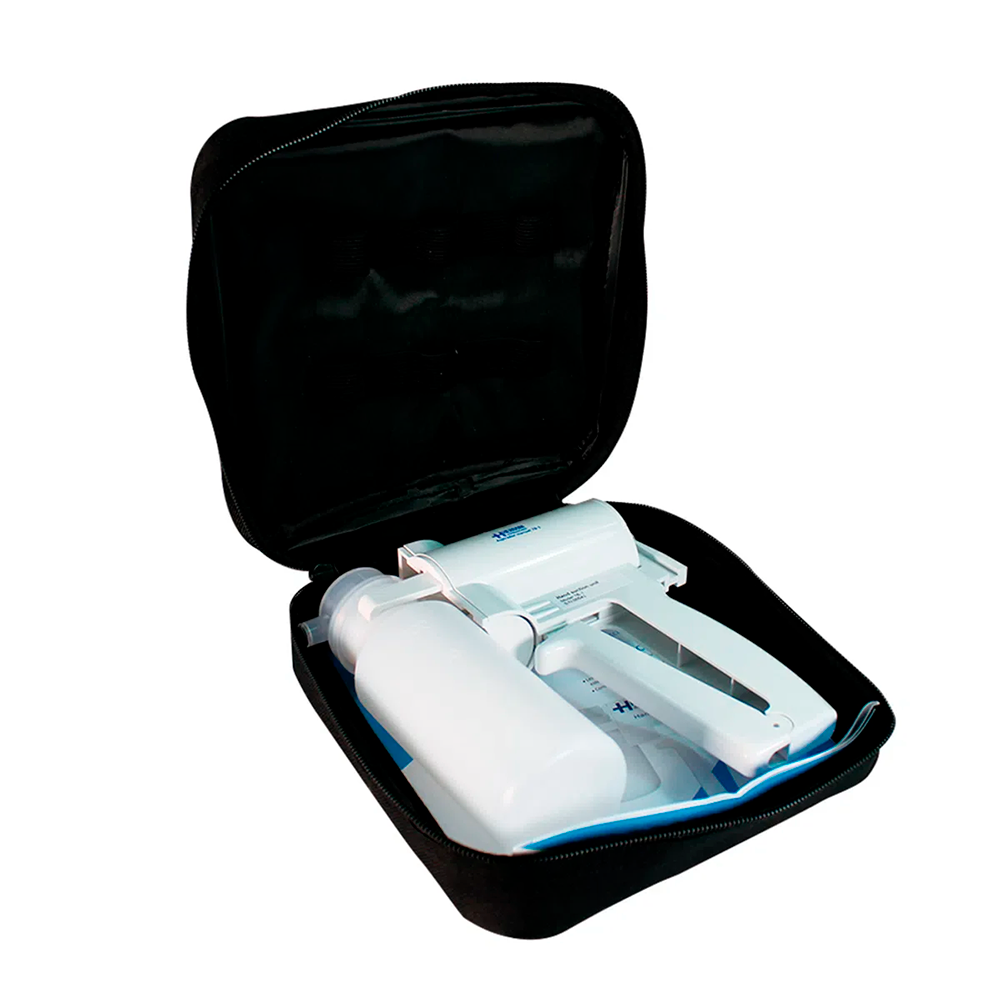 Aspirador manual para succión de flemas, portátil de diseño compacto y ligero. De la marca HERGOM (modelo 7B-1). Es un sistema de vacío que permite recolectar los fluidos de la cavidad oral para prevenir broncoaspiración. Una herramienta esencial para el manejo de la vía aérea, imprescindible para llevar en cualquier botiquín de emergencias o bien para el cuidado de su enfermo en el hogar.