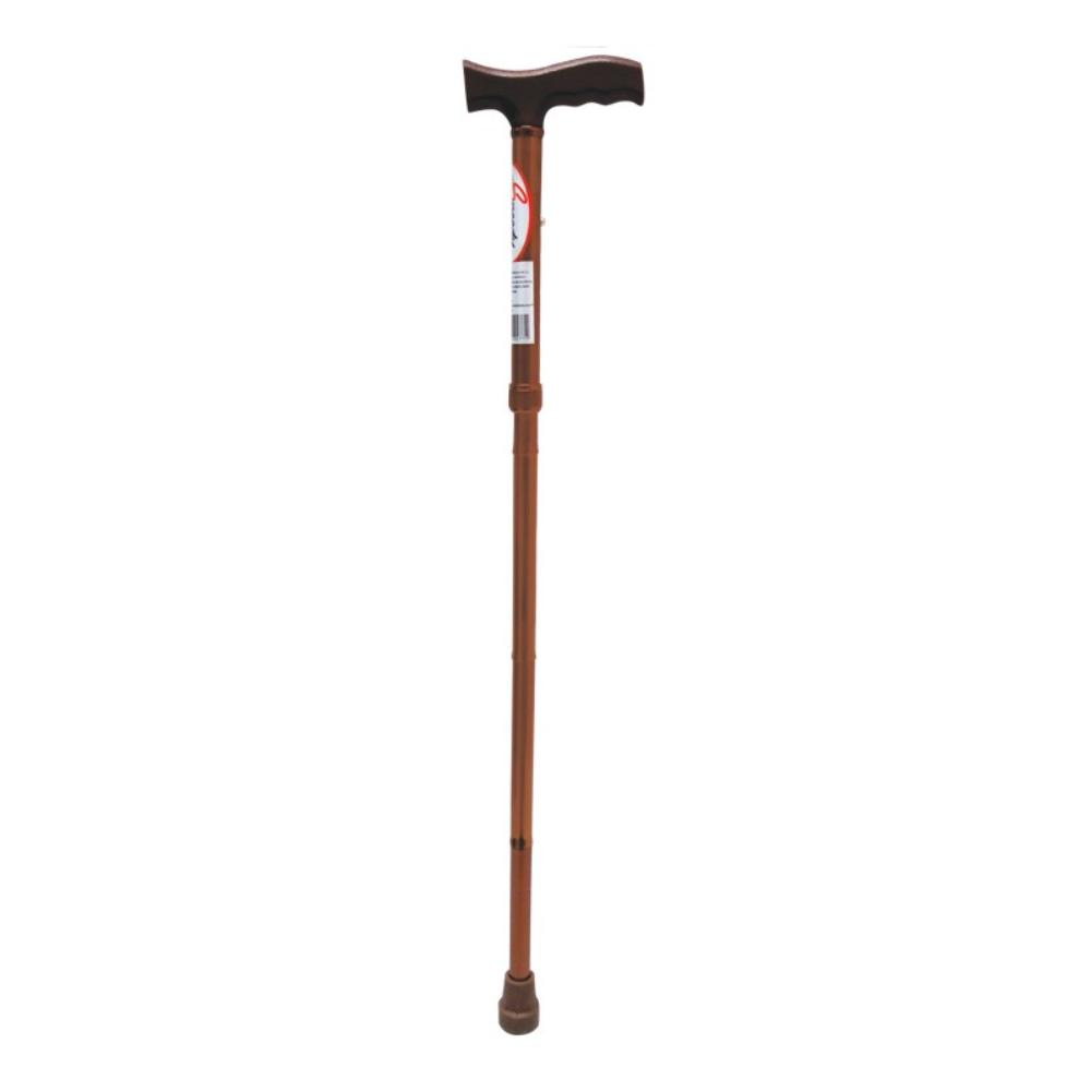 Bastón plegable en forma de "T". color bronce de la marca Speedy. Fabricado en tubo de aluminio de alta duración, con una goma antiderrapante para una mayor seguridad al caminar; gracias a su mango ergonómico y y acojinado en forma de T, el paciente tendrá un mejor agarre que le dará mayor estabilidad. Con capacidad de peso de hasta 90 kg.