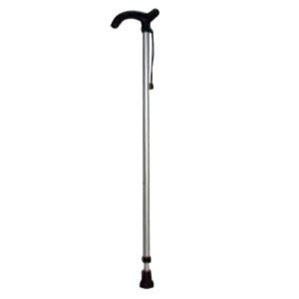 Bastón con mango tipo alemán de color plata. Económico. Fabricado en tubo de aluminio color plata; puño maneral proyectado en material plástico rígido color negro; de un solo apoyo, con el regatón de hule macizo antiderrapante y buje de plástico rígido que no permite la vibración. Con posibilidades de ajuste de altura de 70 a 90 cms. Capacidad de peso aproximado de hasta 90 kg.