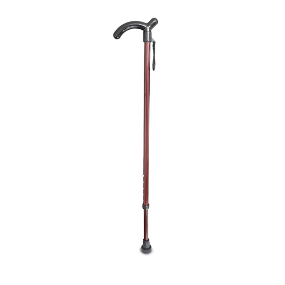 Bastón con mango tipo alemán, color vino. Económico. Con altura ajustable con sistema de botón; resistente a grandes impactos; de un solo apoyo con el regatón anti derrapante, para evitar deslizamientos indeseados; fabricado en materiales de alta calidad, que aseguran una larga vida útil; bastón elaborado a base de aluminio resistente, cuenta con mango ergonómico. Altura ajustable.
