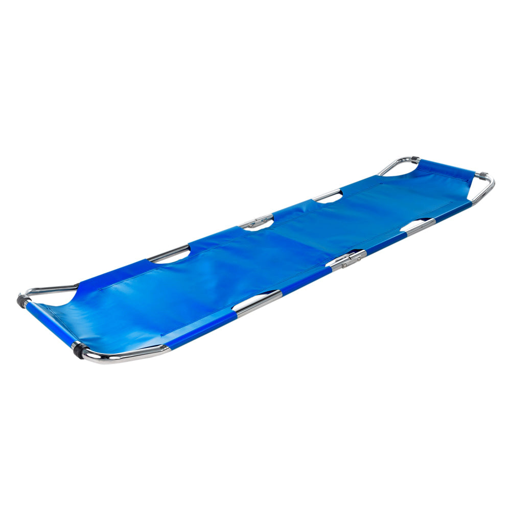 Camilla plegable marina de color azul. Ideal para la primera intervención o traslado del paciente, Brindando seguridad gracias a su gran soporte.