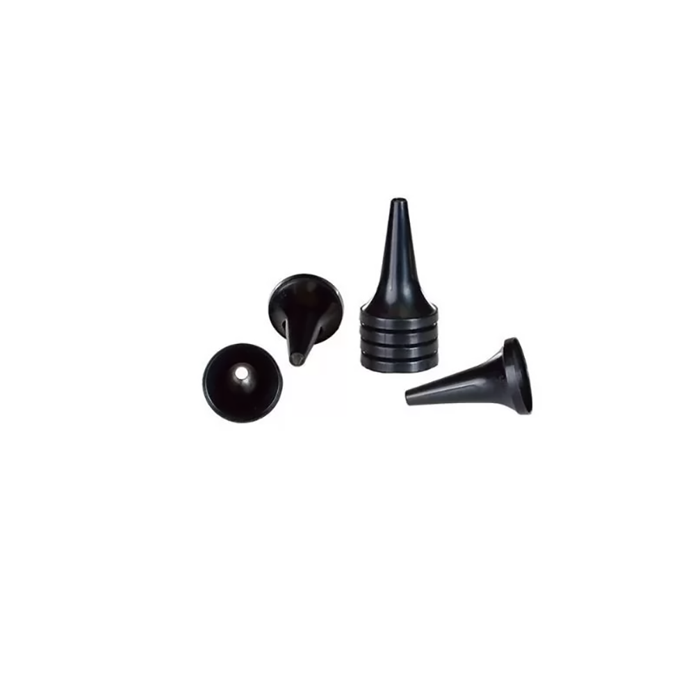 Espéculo para otoscopio. Pieza en forma de cono que se inserta en el canal auditivo para examinar el oído. Su función es mantener el canal abierto y permitir una mejor visualización del oído interno