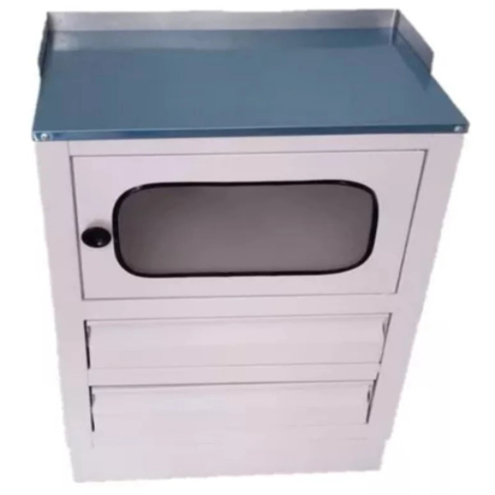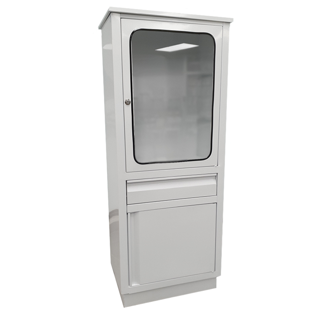 - Vitrina médica con una puerta superior con vidrio, un cajón central y puerta