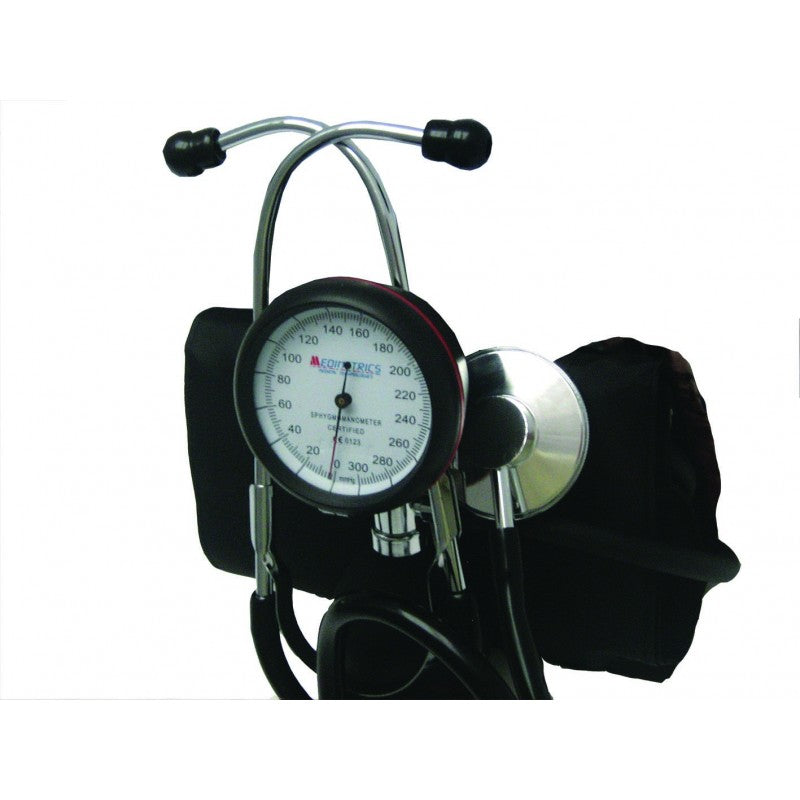 KIT BAUMANÓMETRO Y ESTETOSCOPIO SIMPLE COLOR NEGRO. Marca Medimetrics (modelo 5881). Baumanómetro con manómetro de alta precisión y estetoscopio Duplex, ideal para monitorear, evaluar y diagnosticar a pacientes. Ofrece medición precisa del pulso, excelente sensibilidad acústica y comodidad en su uso, disponible en una variedad de colores vibrantes. Características: