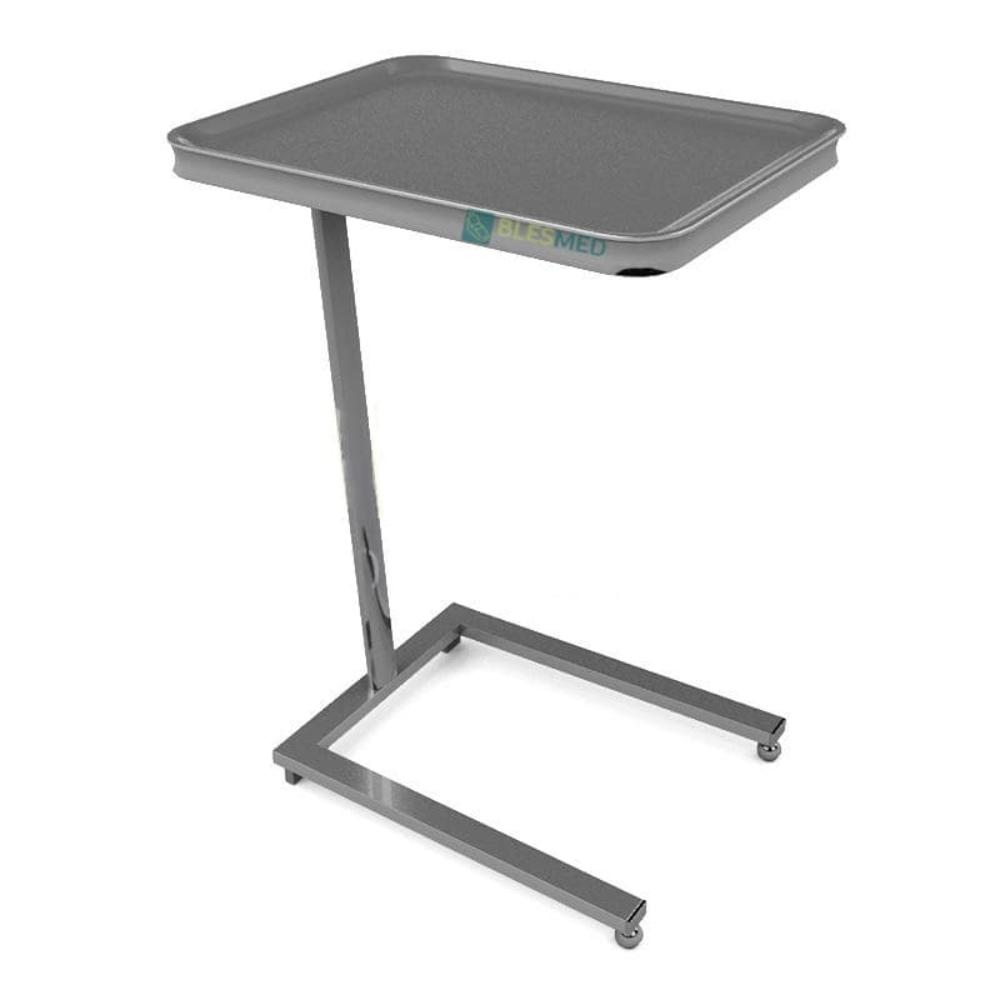 MESA MAYO CON CHAROLA ACERO INOXIDABLE. Auxiliar para el uso de instrumental médico en quirófano, diseñada para facilitar al médico el acceso rápido a cualquier instrumento durante procedimientos. La mesa es de acero inoxidable, lo que asegura durabilidad y fácil limpieza. Además, su diseño permite moverla de manera fácil y libre, optimizando el espacio en el quirófano. Características:
