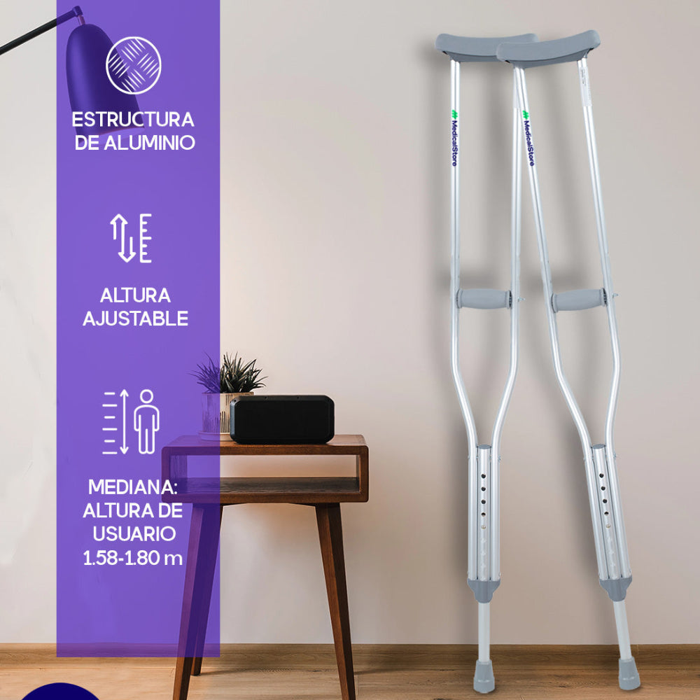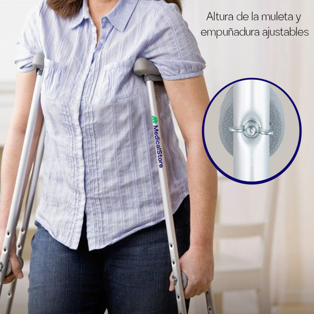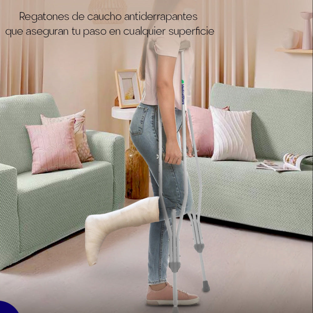 Las Muletas Axilares Ajustables de Aluminio de Medical Store están diseñadas para brindar máximo confort, seguridad y estabilidad a usuarios en rehabilitación, recuperación de lesiones o movilidad reducida. Fabricadas con tubos de aluminio ligeros y resistentes, estas muletas cuentan con axileras y puños acolchados que proporcionan un apoyo cómodo durante el uso prolongado.
