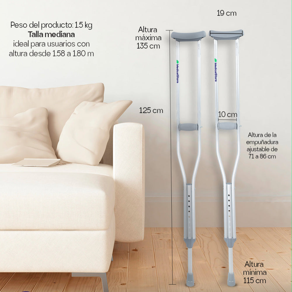 - Mediana (Altura paciente: 1.57–1.70 m | Altura muleta: 114.3–134.62 cm)