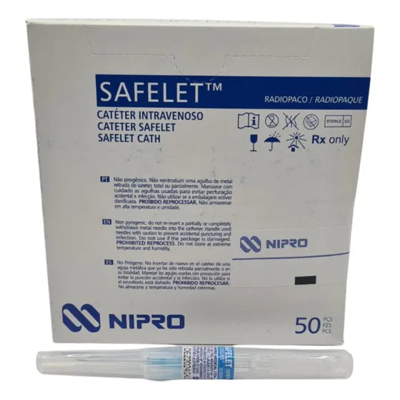 Catéter de material ETFE (Etileno Tetrafluroetileno), en empaque individual de un solo uso, estéril, radiopaco, biocompatible, desechable, cámara de retroceso transparente que permite asegurar cuando el catéter está en la vena. Cuenta con marca relieve en el cubo de la aguja para facilitar la orientación del bisel.