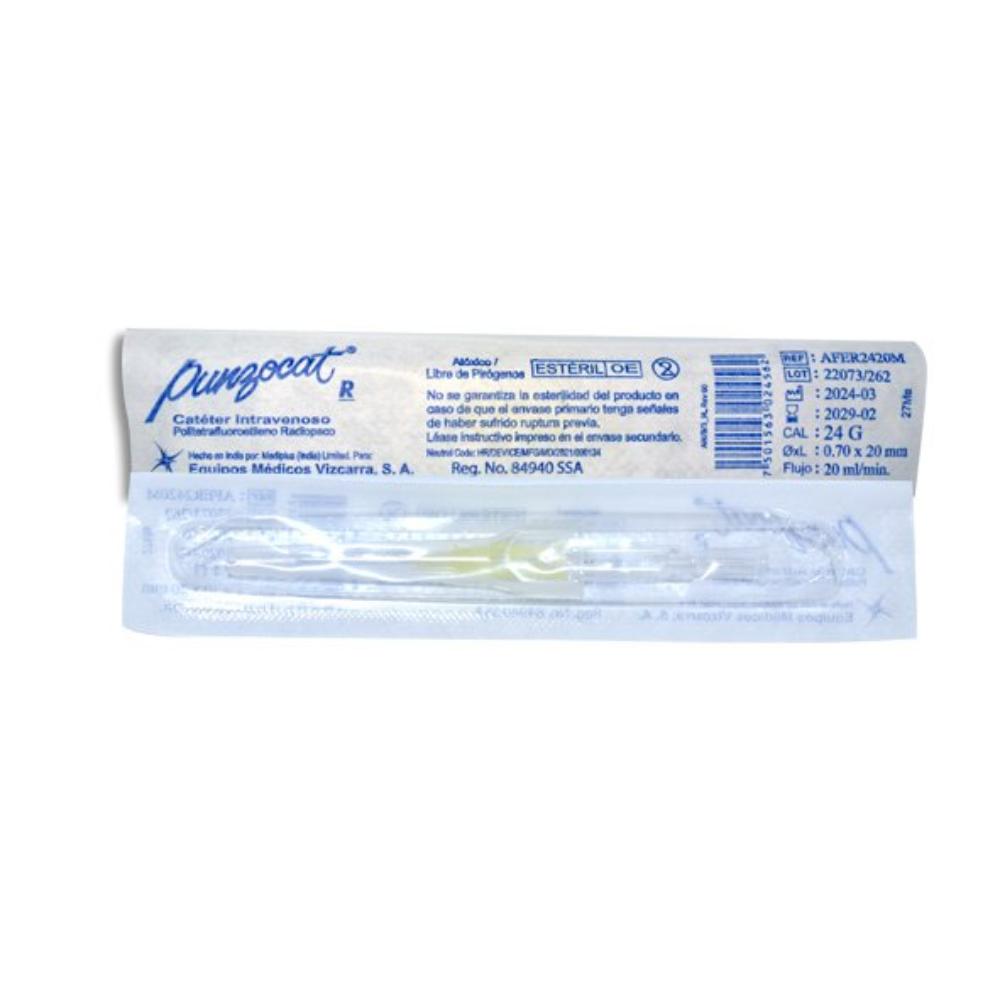 PUNZOCAT CALIBRE 24 PIEZA. Marca Vizcarra. Catéter intravenoso periférico utilizado para la transfusión de soluciones medicinales y sanguíneas. Características: