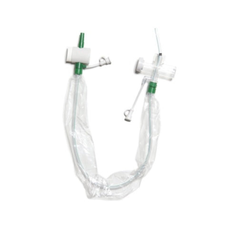 SISTEMA DE SUCCIÓN CERRADO, ASPIRA TRAQUEAL PARA ADULTO CALIBRE 14 FR. El sistema de succión cerrado de aspiración "traqueostomía" para adulto 14 FR es un circuito cerrado diseñado para aspirar al paciente sin desconectarlo de la ventilación mecánica invasiva (VMI). La sonda se mantiene protegida por una camisa de plástico, garantizando la seguridad y eficacia del procedimiento. El catéter de aspiración cerrado se conecta al swivel en un extremo y al aspirador en el otro, proporcionando un manejo seguro y práctico.